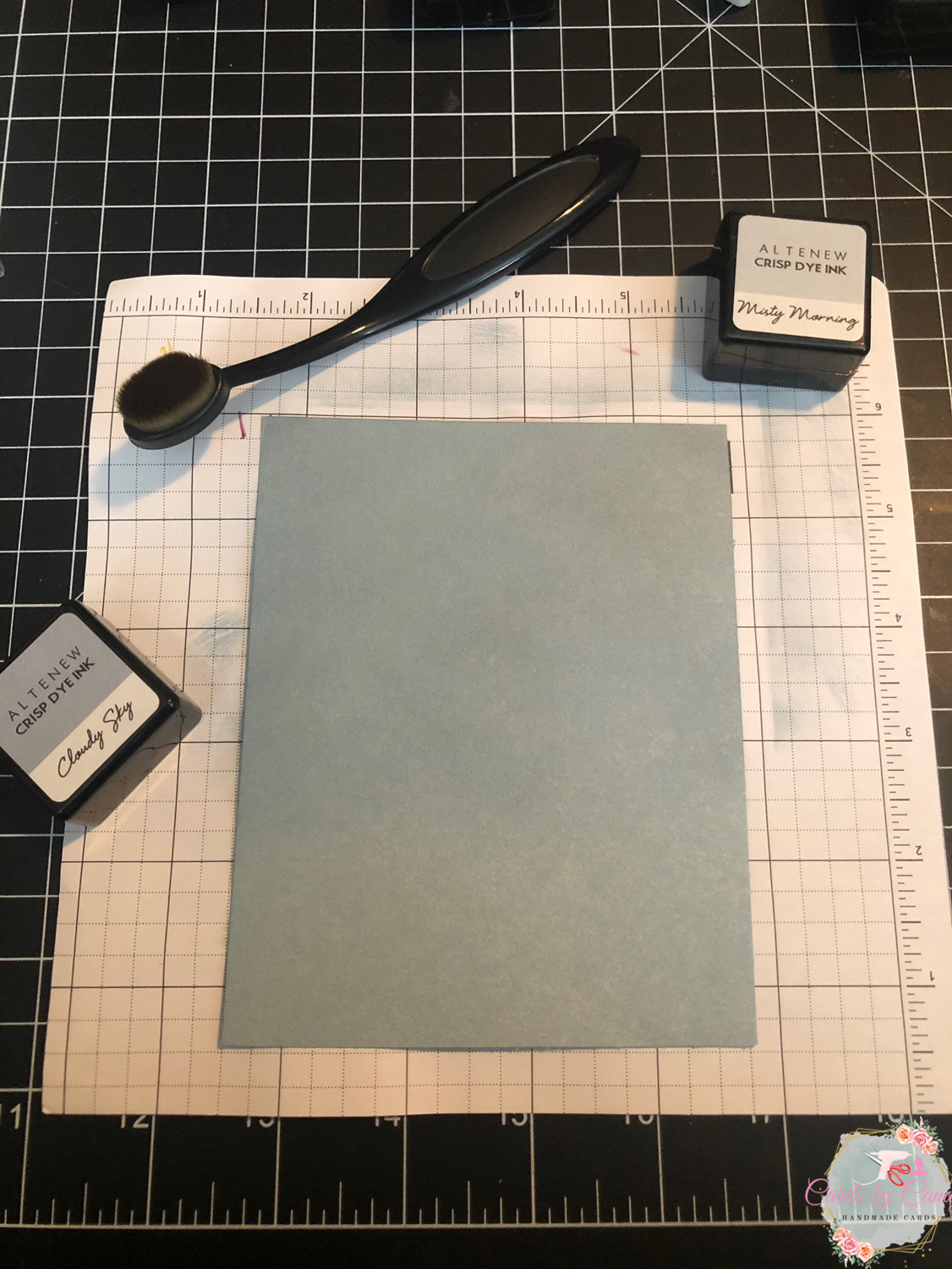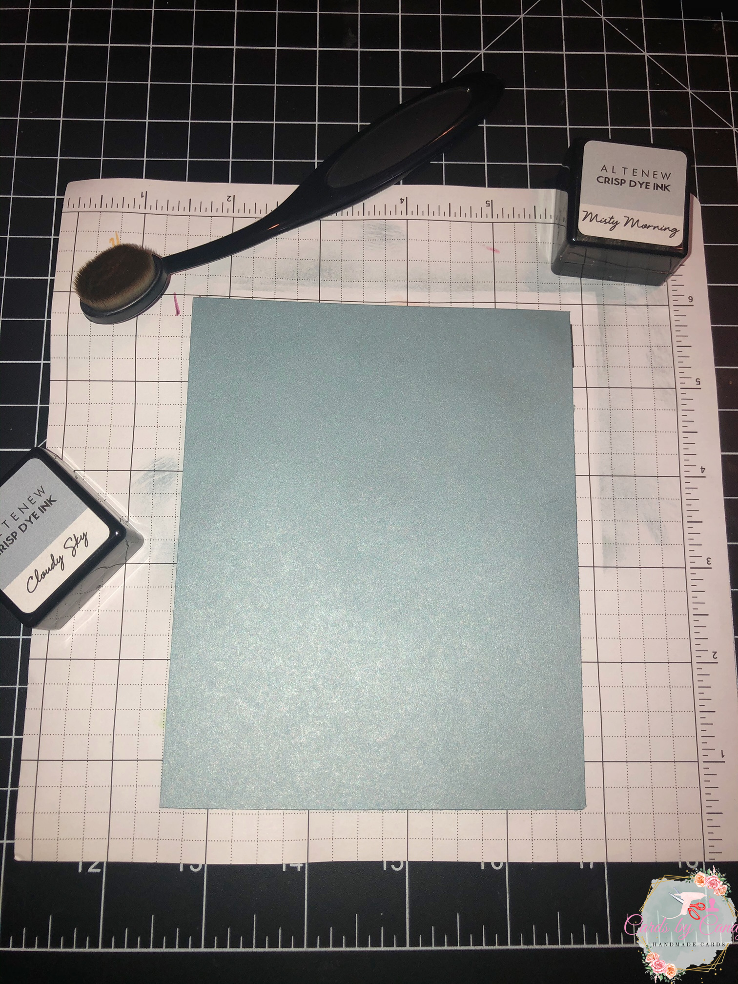 Once the sky was blended to the exact hue I wanted, I adhered it to the card base using permanent double sided tape. I intentionally left a lot of space at the bottom to have room for the mountains, trees, and pathway. Also, to save time, I only blended ink on the top of the paper.
