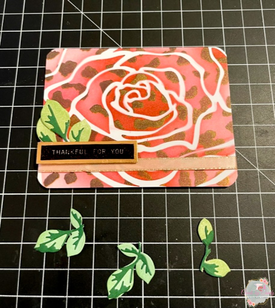 Originally, I had planned to have the leopard print in only the gold; however, on top of the red inks, it almost looked orange instead of gold. I added the gray ink on top of it and when you tilt the card in the light, you will see the gold shimmer. It’s really important to leave the first stencil in place so that the second stencil will not overshadow the first stencil.