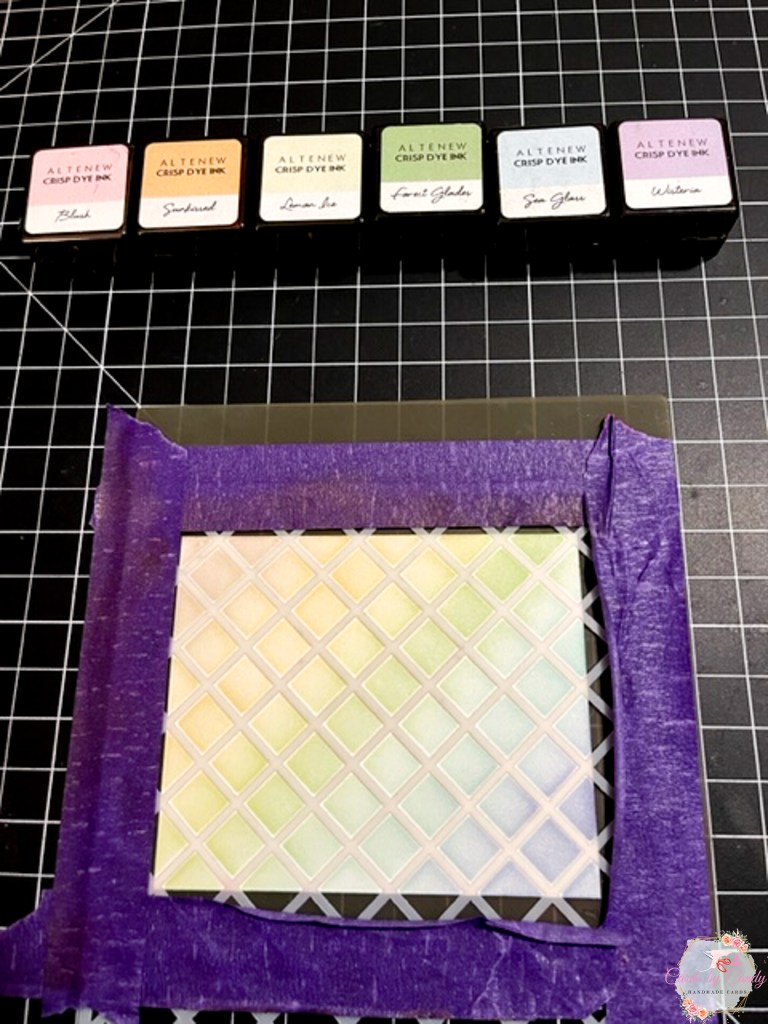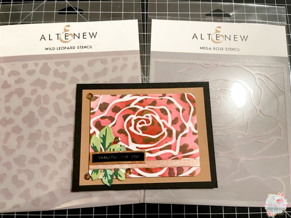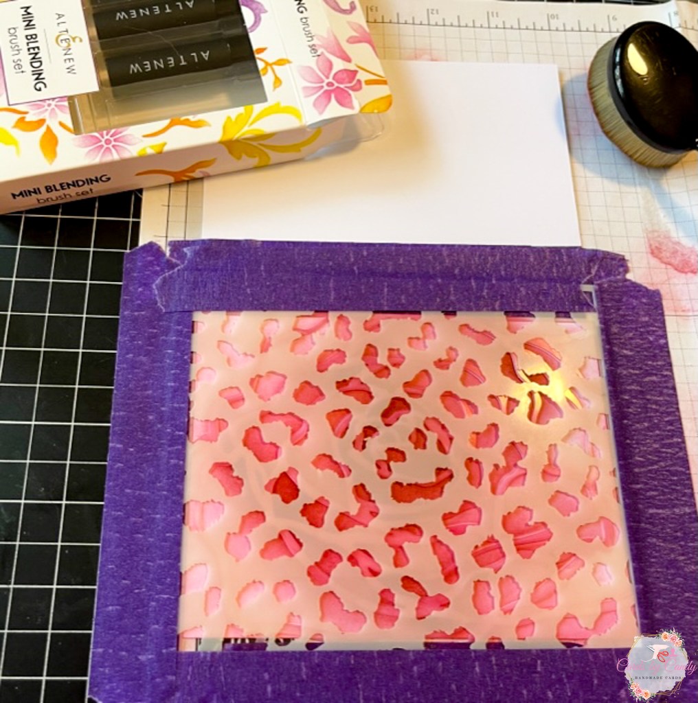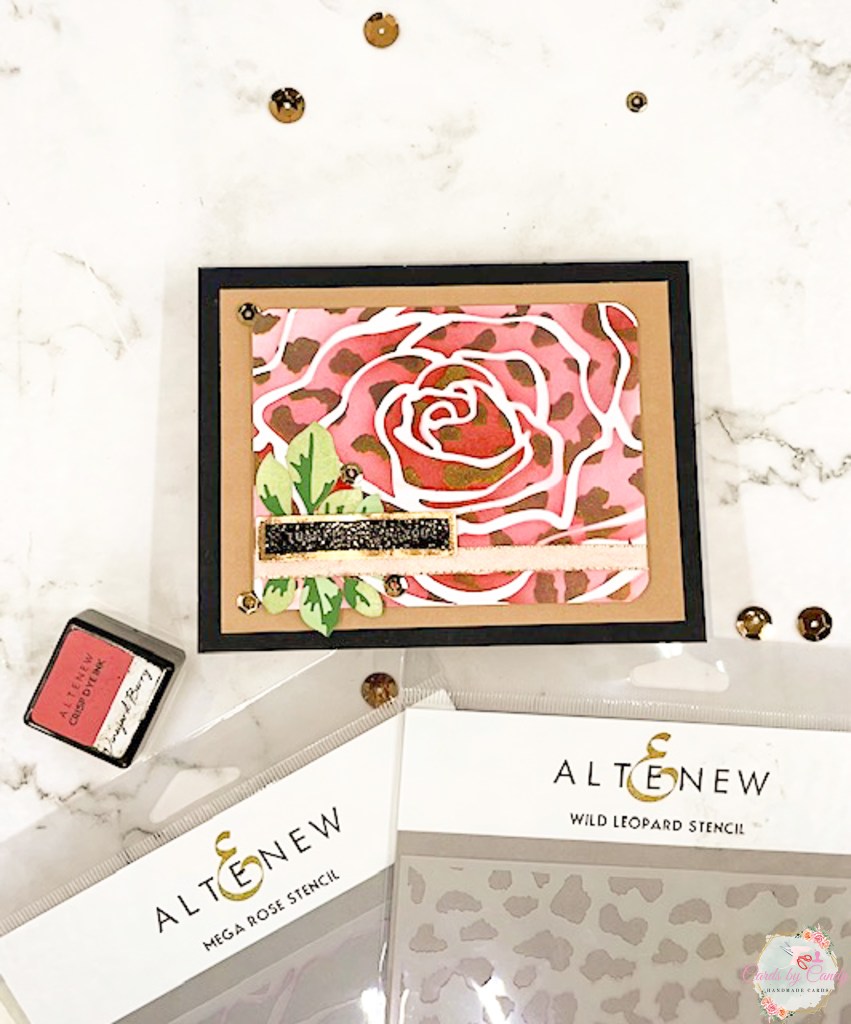For the first card panel, I layered the Altenew Mega Rose Stencil and the Altenew Leopard Print Stencils. Here is how I created this card background.