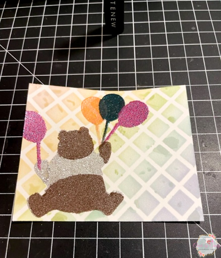 4. Continue stenciling hands and body of bear with Versamark ink. Use bronze embossing powder.