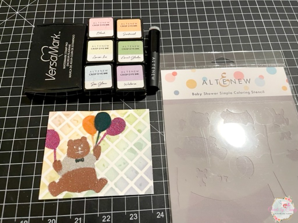 1. Use Baby Shower Simple Coloring Stencil and rub Versamark ink over bear head stencil.